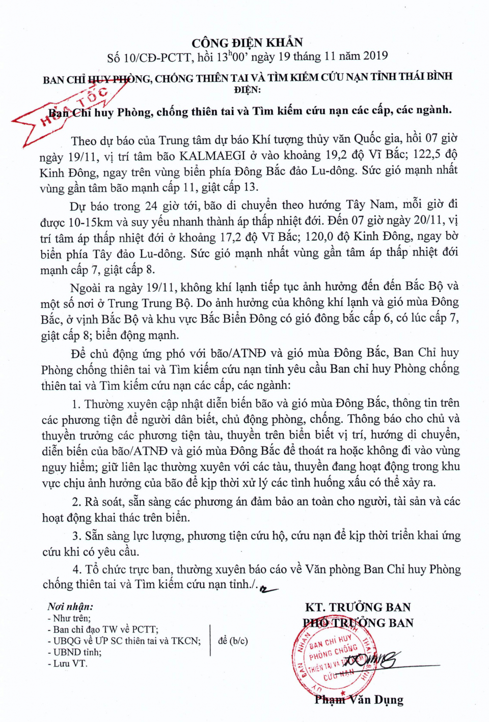 Ngày 19/11, Ban chỉ huy Phòng chống thiên tai và TKCN tỉnh Thái Bình có Công điện khẩn số 10/CĐ-PCTT gửi Ban chỉ huy phòng chống thiên tai và TKCN các cấp, các ngành. Nội dung như sau: