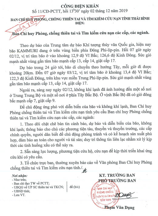 Ngày 02/12, Ban Chỉ huy Phòng chống thiên tai và TKCN tỉnh Thái Bình có Công điện số 11/CĐ-PCTT gửi Ban chỉ huy phòng chống thiên tai và TKCN các cấp, các ngành.