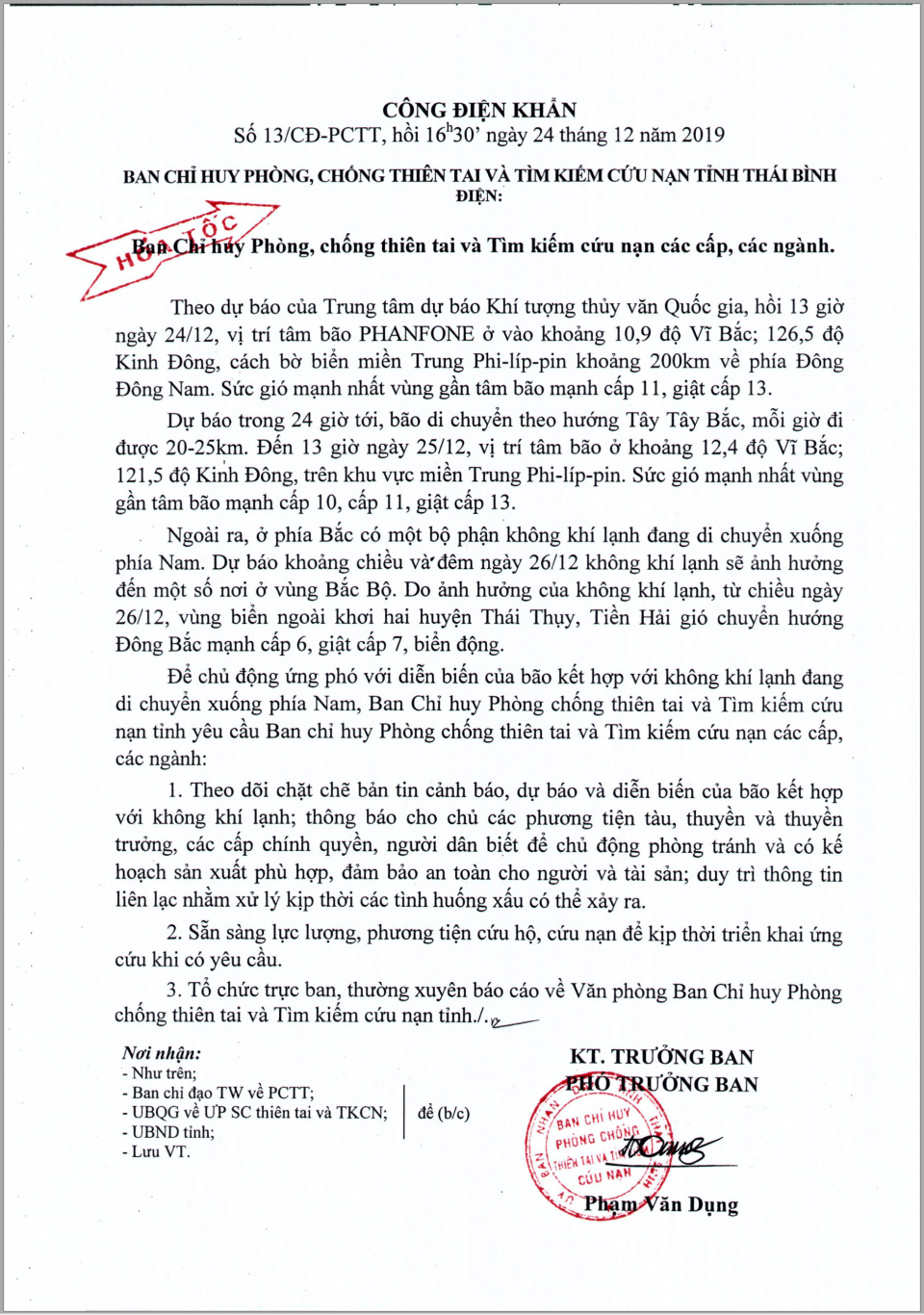 Ngày 24/12, Ban Chỉ huy Phòng chống thiên tai và TKCN tỉnh Thái Bình có Công điện số 13/CĐ-PCTT gửi Ban chỉ huy phòng chống thiên tai và TKCN các cấp, các ngành.