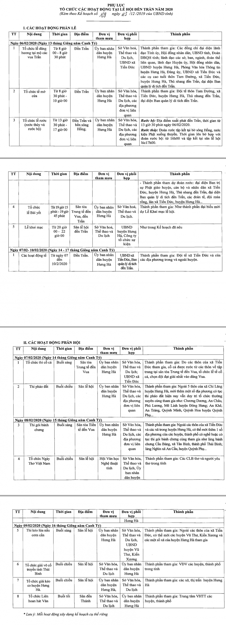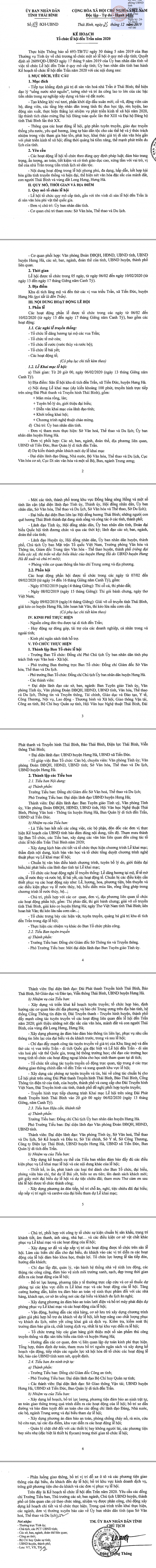 Ngày 23/12/2019 Ủy ban nhân dân tỉnh Thái Bình ban hành Kế hoạch số 139/KH- UBND tổ chức lễ hội đền Trần năm 2020