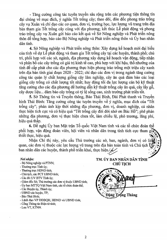 Chỉ thị 02 của UBND tỉnh về "Tết trồng cây đời đời nhớ ơn Bác Hồ" Xuân Canh Tý năm 2020 và phong trào trồng một triệu cây xanh trên địa bàn tỉnh Thái Bình