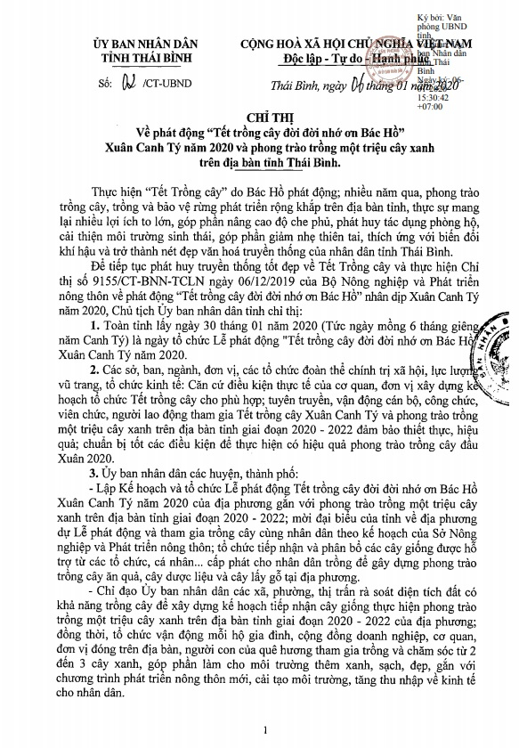 Ngày 06/01/2020, UBND tỉnh Thái Bình ra chỉ thị số 02 về phát động "Tết trồng cây đời đời nhớ ơn Bác Hồ" Xuân Canh Tý năm 2020 và phong trào trồng một triệu cây xanh trên địa bàn tỉnh Thái Bình.