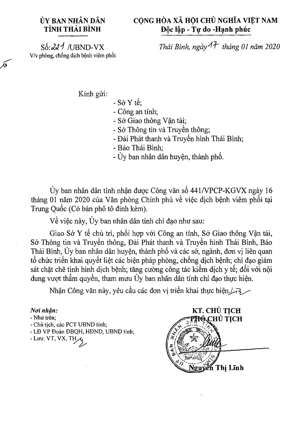 Ngày 17/01/2020, Ủy ban nhân dân tỉnh Thái Bình ra Công văn số 221/UBND-VX về việc phòng chống dịch bệnh viêm phổi.
