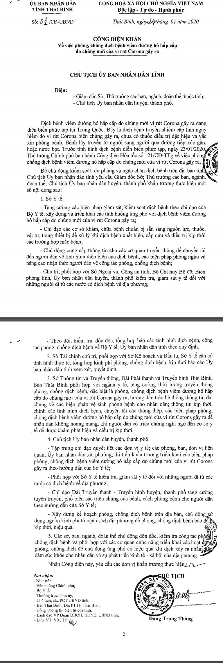 Ngày 24/01/2020, Ủy ban nhân dân tỉnh Thái Bình ra công điện khẩn số 01/CĐ-UBND về việc phòng, chống dịch bệnh viêm đường hô hấp cấp do chủng mới của vi rút Corona gây ra.