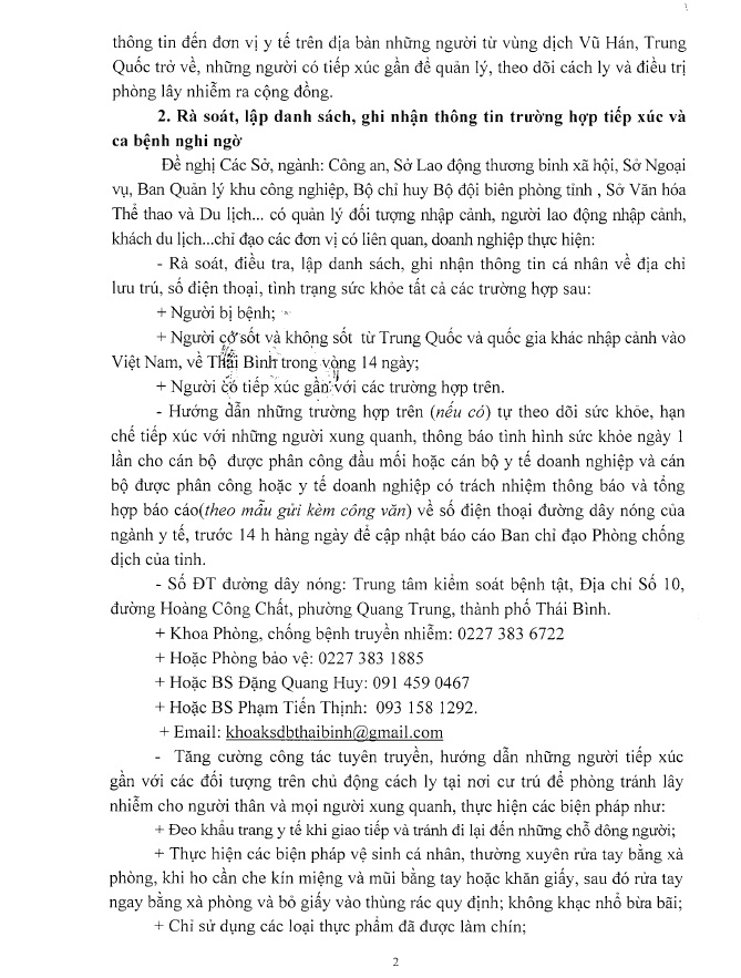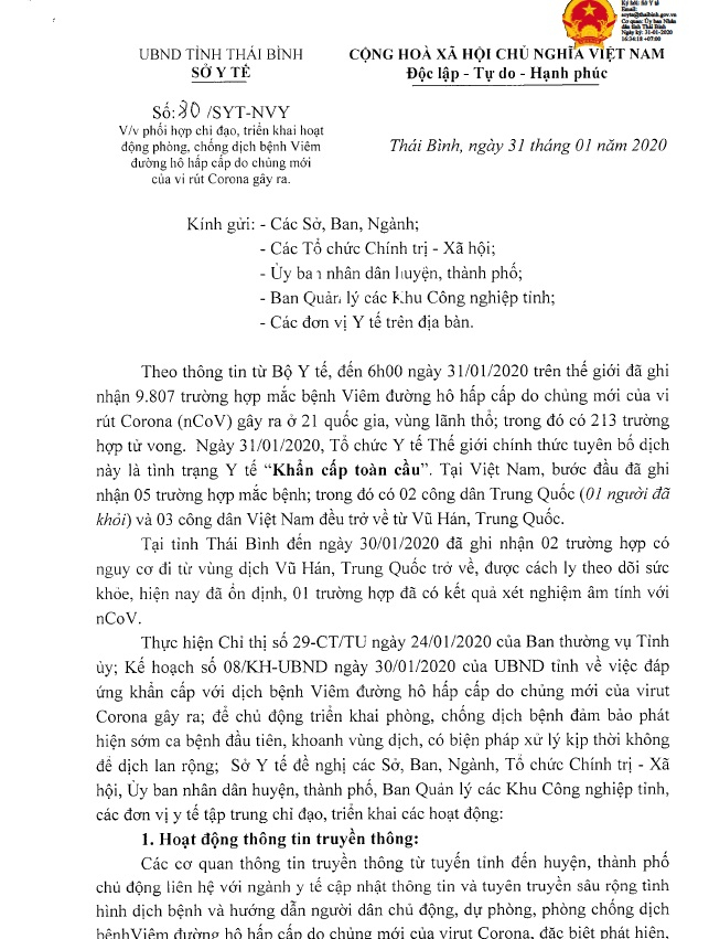 Ngày 31/01, Sở Y tế ra công văn số 80/SYT-NVY về việc phối hợp chỉ đạo, triển khai hoạt động phòng chống dịch bệnh Viêm đường hô hấp cấp do chủng mới của vi rút Corona gây ra