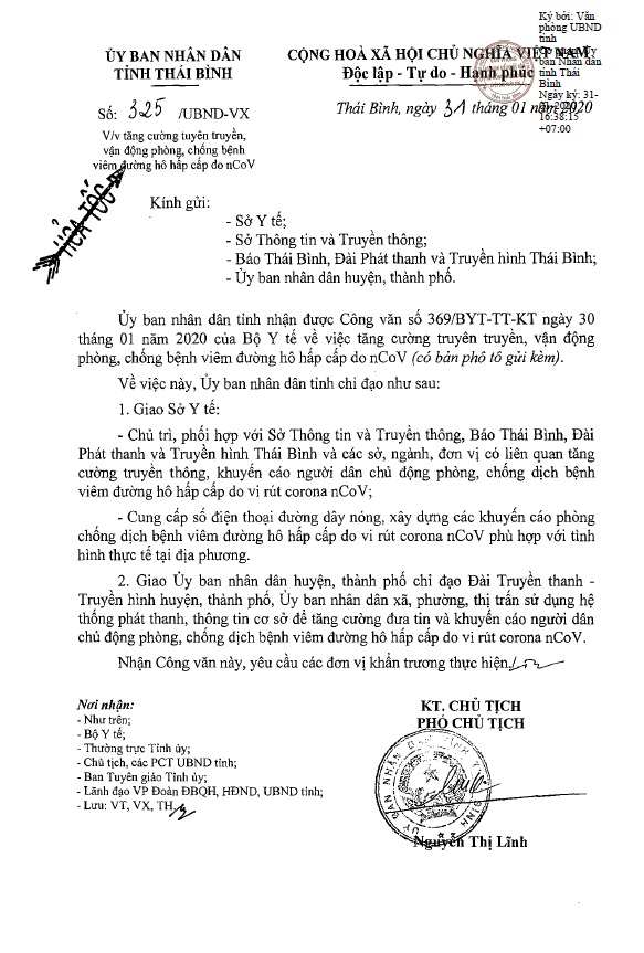 Ngày 31/01, UBND tỉnh ra công văn số 325/UBND-VX về việc tăng cường tuyên truyền, vận động phòng, chống bệnh viêm đường hô hấp cấp do nCoV