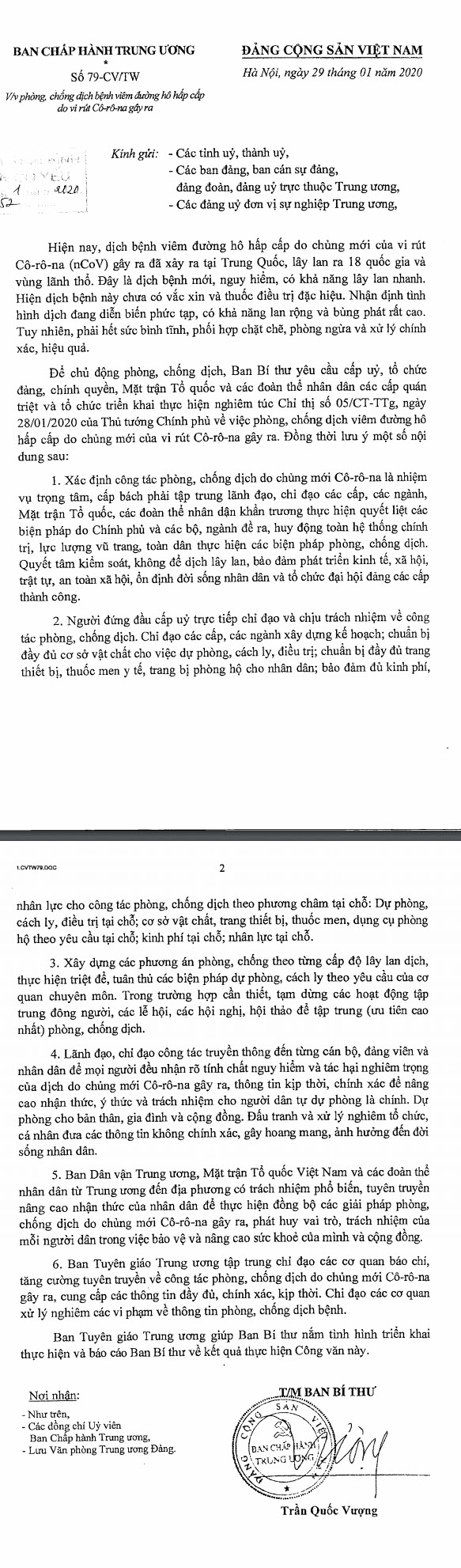 Công văn số 2124-CV/TU về việc quán triệt, triển khai thực hiện chỉ đạo của Ban Bí thư về phòng, chống dịch bệnh viêm đường hô hấp cấp do vi rút Corona gây ra