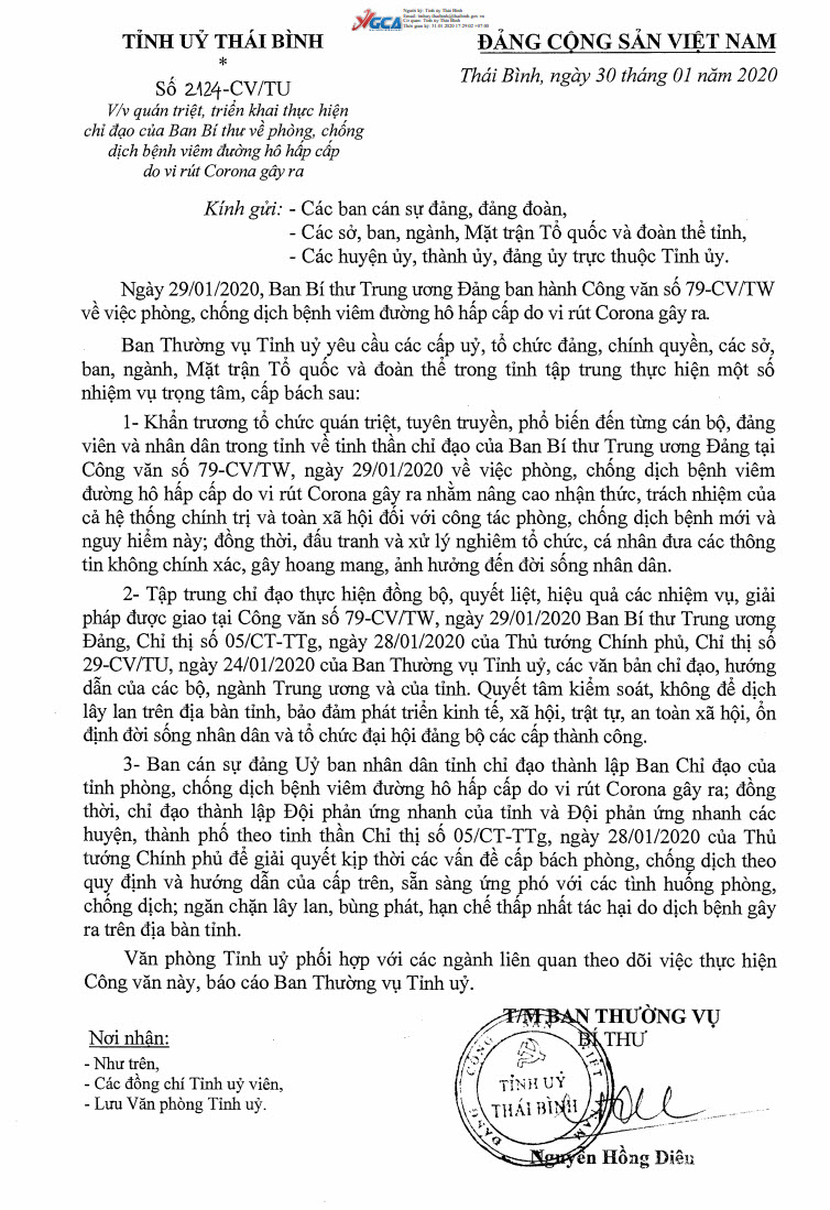 Ngày 30/01/2020, Tỉnh ủy Thái Bình ra Công văn số 2124-CV/TU về việc quán triệt, triển khai thực hiện chỉ đạo của Ban Bí thư về phòng, chống dịch bệnh viêm đường hô hấp cấp do vi rút Corona gây ra.