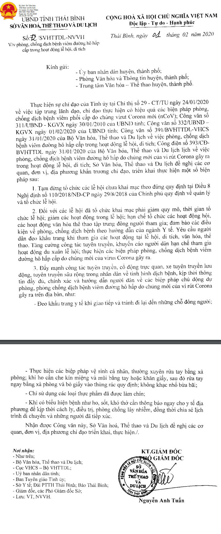 Ngày 01/02/2020, Sở Văn hóa, Thể thao và Du lịch tỉnh Thái Bình ra Công văn số 72/SVHTTDL-NVVH về việc phòng, chống dịch bệnh viêm đường hô hấp cấp trong hoạt động lễ hội, di tích.
