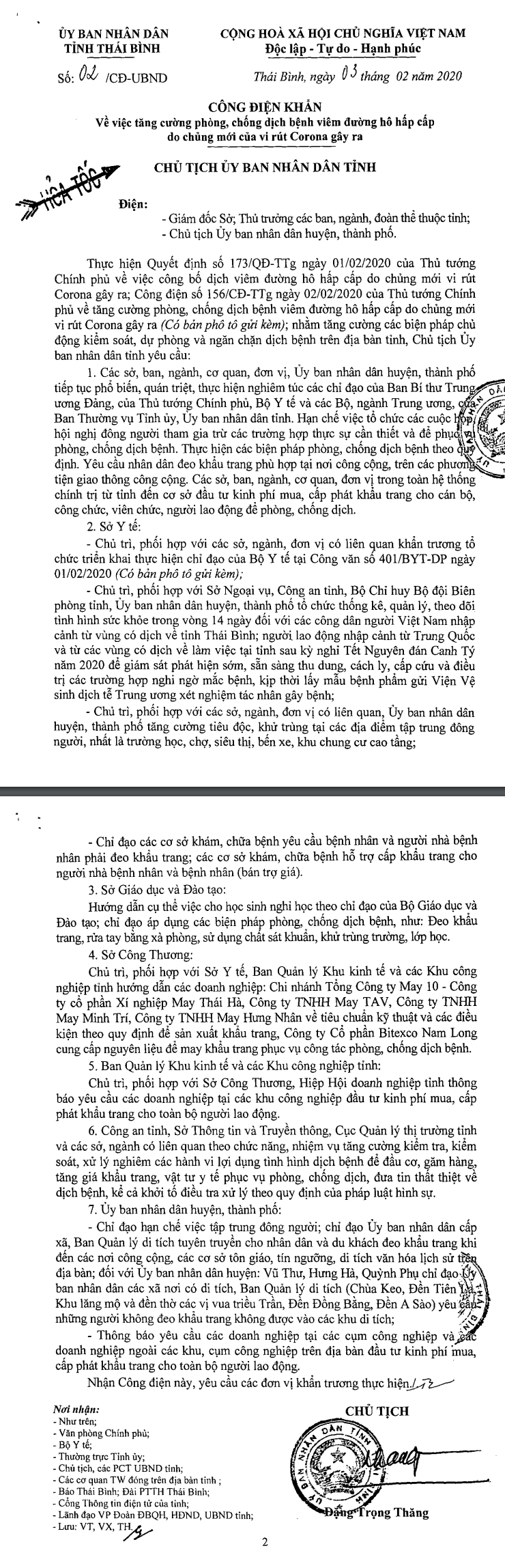 Ngày 03/02/2020, Ủy ban nhân dân tỉnh Thái Bình ra Công điện khẩn số 02/CĐ-UBND về việc tăng cường phòng, chống dịch bệnh viêm đường hô hấp cấp do chủng mới của vi rút Corona gây ra.