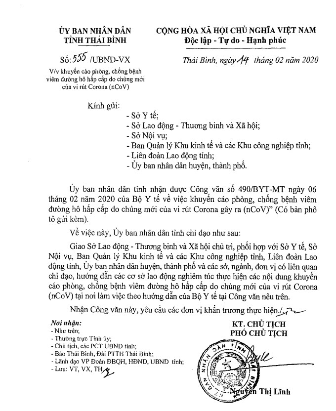 Ngày 14/02/2020, Ủy ban nhân dân tỉnh Thái Bình ra Công văn số 555/UBND-VX về việc khuyến cáo phòng, chống bệnh viêm đường hô hấp cấp do chủng mới của vi rút Corona (nCoV).