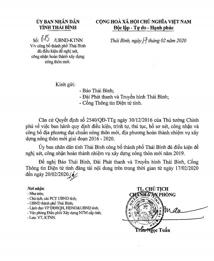 Công văn số 615 của UBND tỉnh về việc công bố thành phố Thái Bình đủ điều kiện đề nghị xét, công nhận hoàn thành xây dựng nông thôn mới