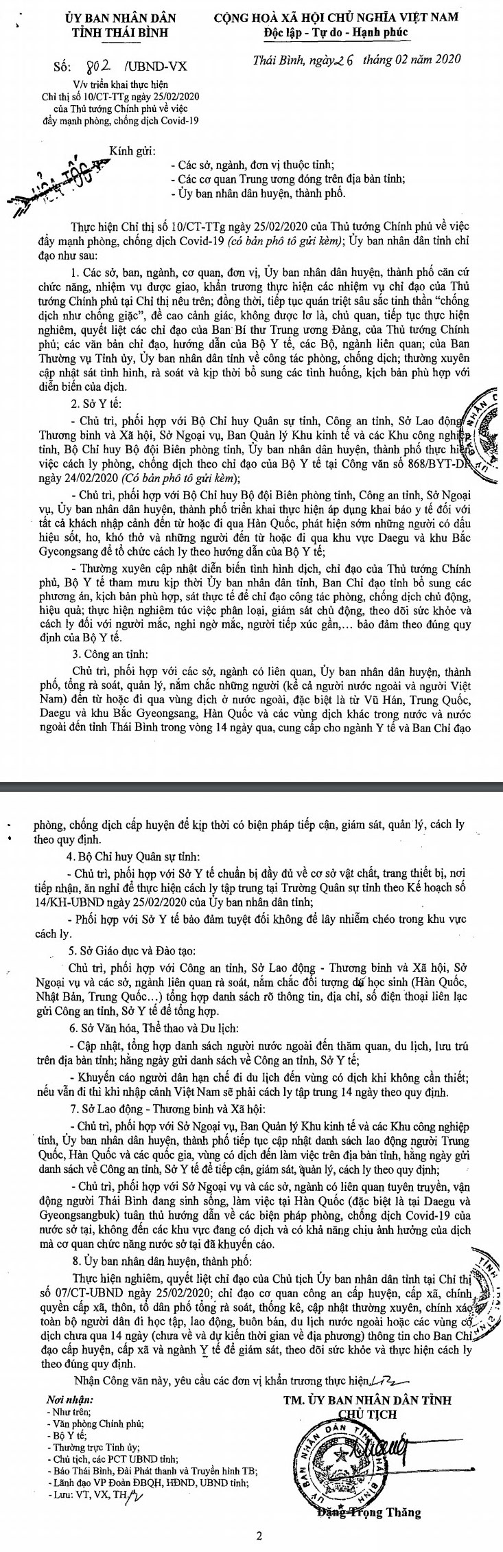 Ngày 26/2, UBND tỉnh có Công văn số 802/UBND-VX về việc triển khai thực hiện Chỉ thị số 10/CT-TTg ngày 25/02/2020 của Thủ tướng Chính phủ về việc đẩy mạnh phòng, chống dịch Covid-19. Nội dung như sau: