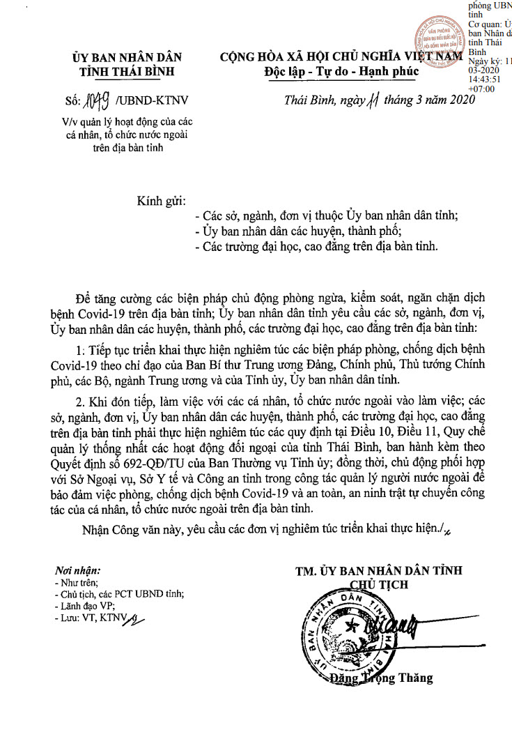 Ngày 11/03/2020, Ủy ban nhân dân tỉnh Thái Bình ra Công văn số 1049/UBND-KTNV về việc quản lý hoạt động của các cá nhân, tổ chức nước ngoài trên địa bàn tỉnh.