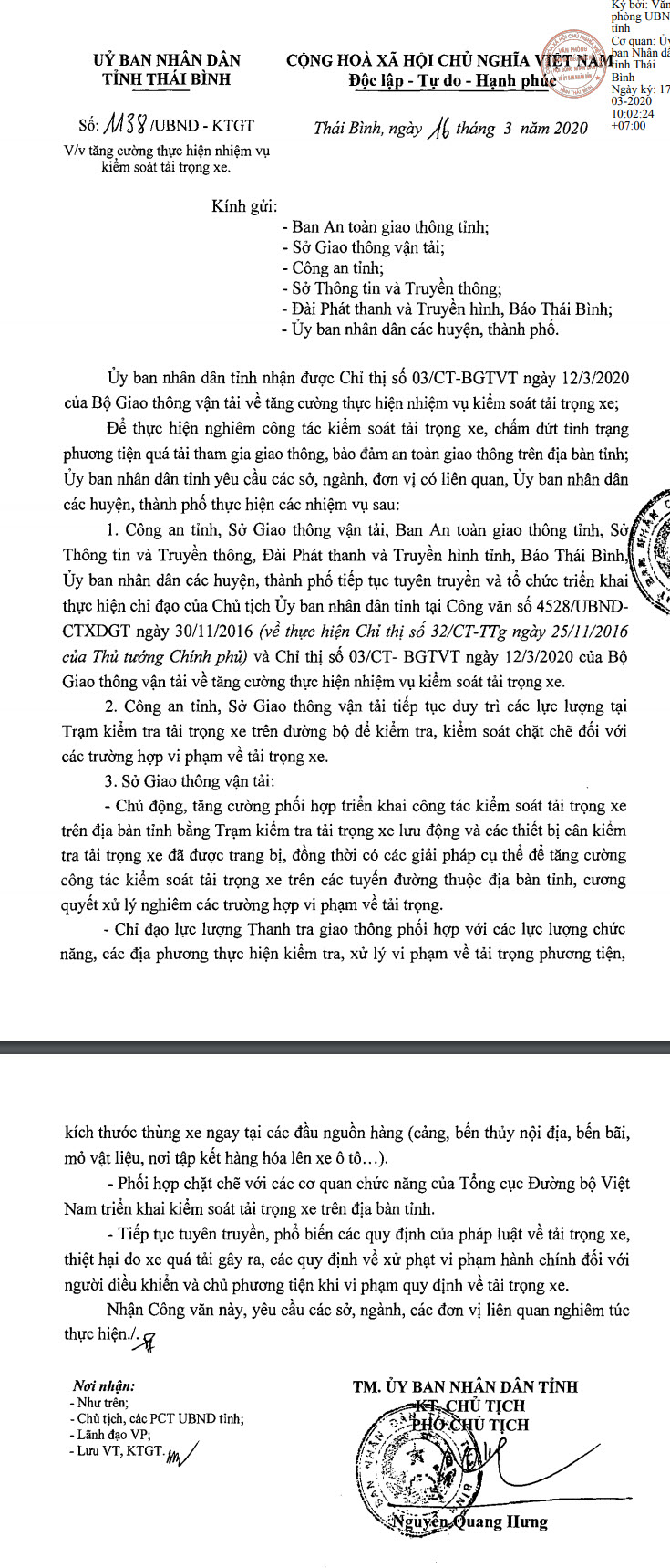 Ngày 16/03/2020, Ủy ban nhân dân tỉnh Thái Bình ra Công văn số 1138/UBND-KTGT về việc tăng cường thực hiện nhiệm vụ kiểm soát tải trọng xe.