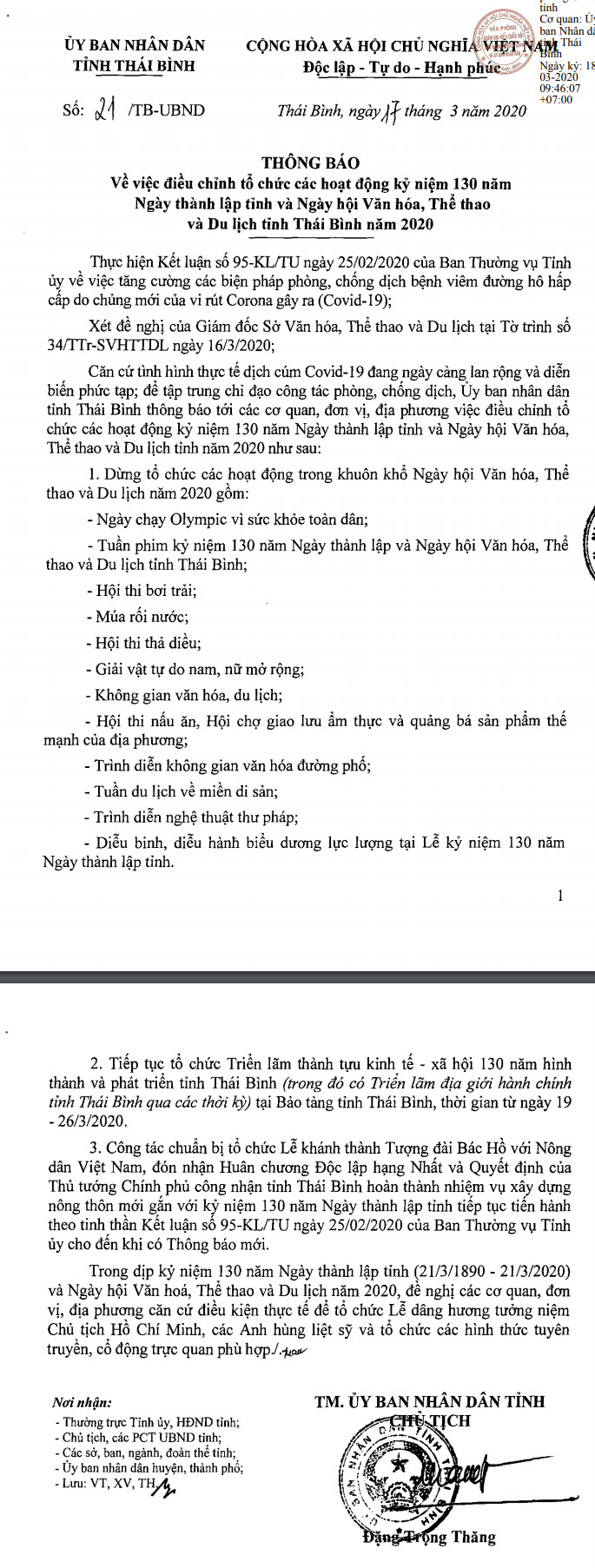 Thông báo số 21/TB-UBND về việc điều chỉnh tổ chức các hoạt động kỷ niệm 130 năm Ngày thành lập tỉnh và Ngày hội Văn hóa, Thể thao và Du lịch tỉnh Thái Bình năm 2020