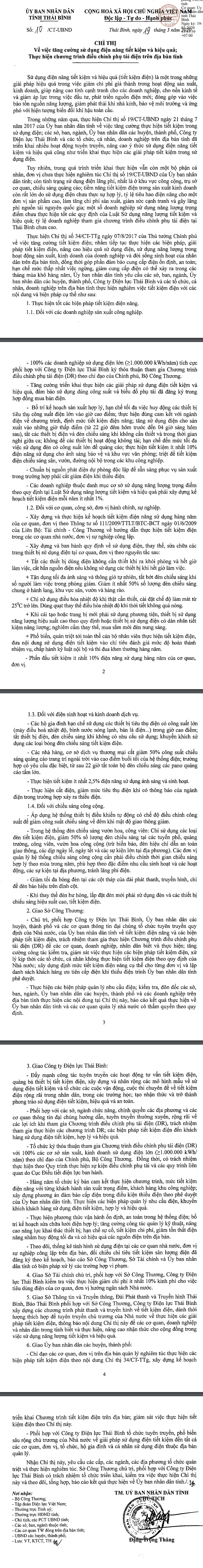 Ngày 19/3/2020, Ủy ban nhân dân tỉnh Thái Bình ban hành Chỉ thị số 10/CT-UBND về việc tăng cường sử dụng điện năng tiết kiệm và hiệu quả; Thực hiện chương trình điều chỉnh phụ tải điện trên địa bàn tỉnh.
