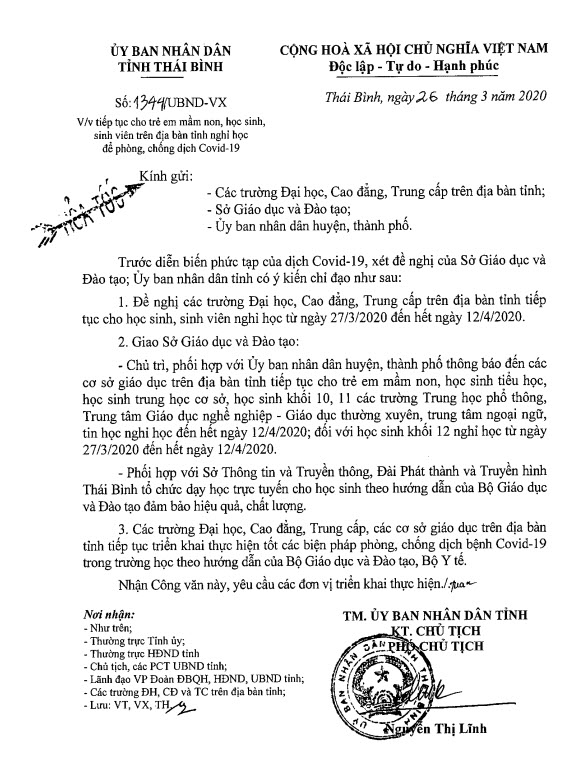 Ngày 26/3/2020, Ủy ban nhân dân tỉnh Thái Bình ban hành Công văn số 1344/UBND-VX về việc tiếp tục cho trẻ em mầm non, học sinh, sinh viên trên địa bàn tỉnh nghỉ học để phòng, chống dịch Covid-19.