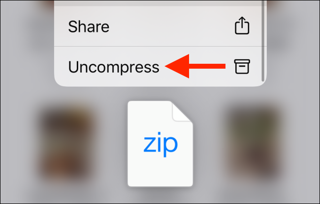 Đầu tiên tệp tin nén dạng Zip phải được lưu vào ứng dụng Files. Tiếp theo bạn chạm và giữ lên biểu tượng tệp tin Zip và chọn Uncompress.