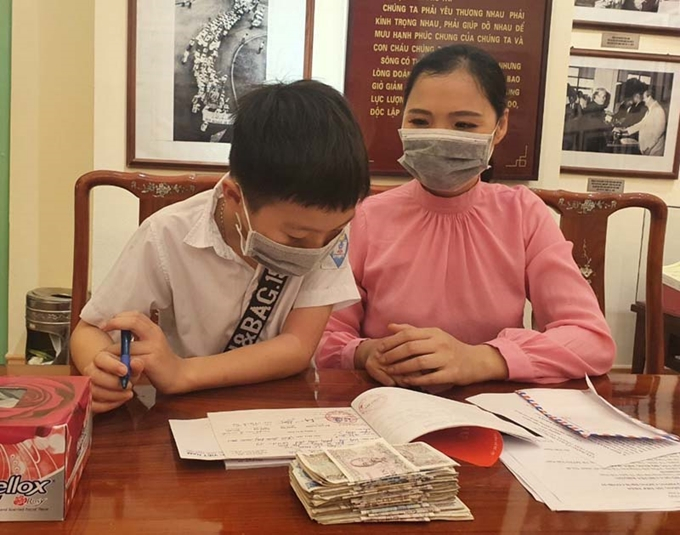 Tuệ cùng mẹ đến Ủy ban Trung ương MTTQ Việt Nam để ủng hộ toàn bộ số tiền tiết kiệm. (Ảnh:TH)
