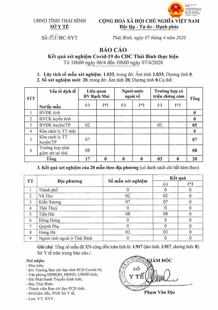 Ngày 07/4, Sở Y tế có báo cáo số 158/BC-SYT về việc công bố kết quả xét nghiệm xác định nhiễm Covid-19 do CDC Thái Bình thực hiện đến 10h00' ngày 07/4.