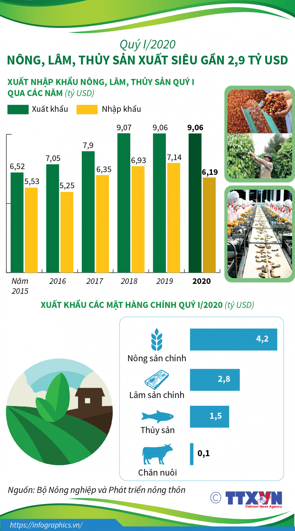 Trong quý I/2020, xuất khẩu nông, lâm, thủy sản ước đạt 9,06 tỷ USD, tương đương cùng kỳ năm 2019, Tuy nhiên, do nhập khẩu giảm nên xuất siêu đạt gần 2,9 tỷ USD, tăng 48,9% so với cùng kỳ năm trước.