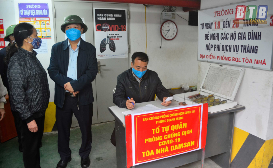 Sau khi nghe báo cáo công tác phòng, chống dịch Covid - 19 và kiểm tra thực tế, đồng chí Nguyễn Quang Hưng, Phó Chủ tịch UBND tỉnh ghi nhận, biểu dương những nỗ lực, cố gắng của Ban quản lý, Tổ tự quản tại Chung cư Petro Thăng Long và Chung cư Damsan Quang Trung trong công tác tuyên truyền, vận động người dân chấp hành nghiêm Chỉ thị 16 của Thủ tướng Chính phủ và Công điện khẩn 04 của UBND tỉnh. Các chung cư đã tuyên truyền trực quan bằng các tờ rơi, thông báo, áp phích tại các bảng tin chung của tòa nhà; tổ chức đo thân nhiệt, sát khuẩn tay tại tất cả các sảnh. Đối với các diện tích công cộng như sảnh, hành lang, nhà sinh hoạt cộng đồng cũng thường xuyên được vệ sinh lau dọn bằng dung dịch khử khuẩn. Đồng chí Phó Chủ tịch UBND tỉnh đề nghị 2 khu chung cư tiếp tục thực hiện tốt công tác cách ly toàn xã hội, giám sát chặt chẽ người ở nơi khác ra vào chung cư. Tuyên truyền, nhắc nhở cư dân chỉ ra khỏi nhà khi có việc cần thiết, không tụ tập sang nhà nhau chơi.