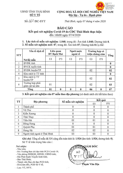 Ngày 07/4, Sở Y tế có báo cáo số 160/BC-SYT về việc công bố kết quả xét nghiệm xác định nhiễm Covid-19 do CDC Thái Bình thực hiện đến 16h00' ngày 07/4.