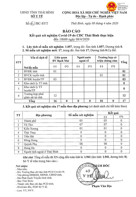 Ngày 08/4, Sở Y tế có báo cáo số 162/BC-SYT về việc công bố kết quả xét nghiệm xác định nhiễm Covid-19 do CDC Thái Bình thực hiện đến 10h00' ngày 08/4.