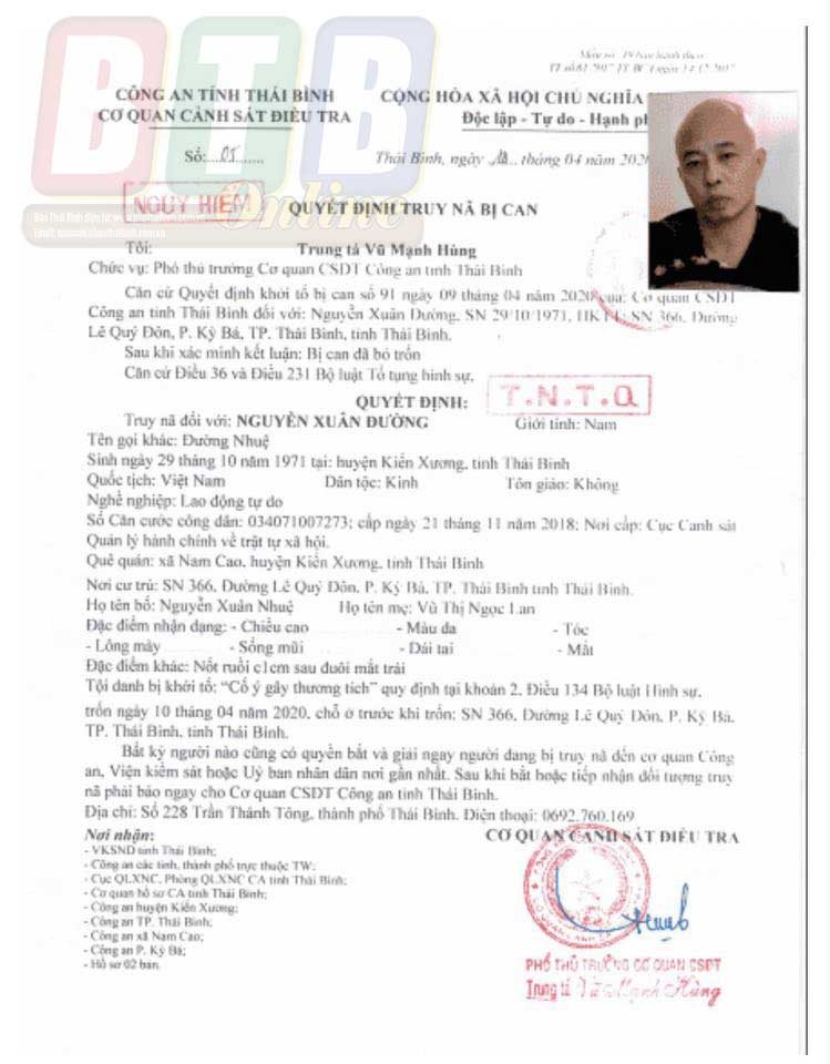 Công an tỉnh khởi tố bị can và ra lệnh truy nã Nguyễn Xuân Đường về tội “Cố ý gây thương tích”