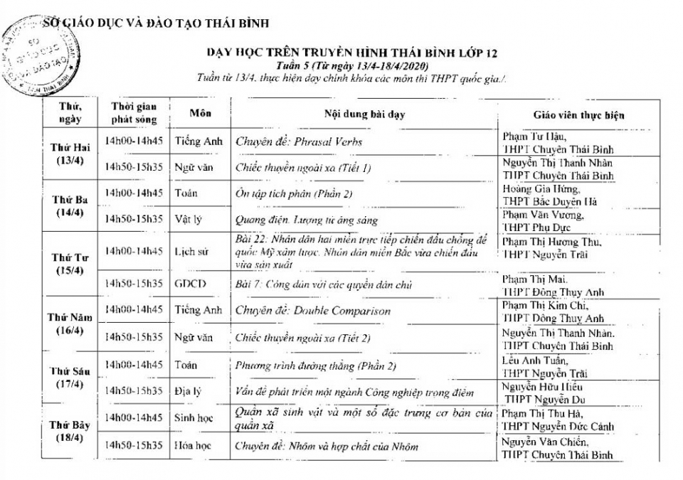 Lịch phát sóng dạy học trực tuyến trên Báo Thái Bình điện tử, Đài Phát thanh – Truyền hình Thái Bình từ 13 - 18/4
