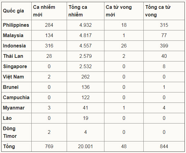 Singapore hôm nay chưa công bố số ca nhiễm và chết vì nCoV. Việt Nam, Lào, Campuchia và Đông Timor là những nước Đông Nam Á chưa ghi nhận trường hợp tử vong nào do Covid-19.
