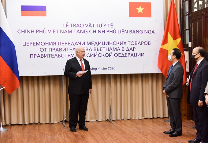 Thừa ủy quyền của Thủ tướng Chính phủ, ngày 13/4, Thứ trưởng Ngoại giao Tô Anh Dũng đã trao số hàng hỗ trợ phòng chống dịch COVID-19 của Chính phủ và nhân dân Việt Nam gửi tặng Chính phủ và nhân dân Liên bang Nga 150.000 khẩu trang vải kháng khuẩn chống giọt bắn do Việt Nam sản xuất. Tham dự buổi lễ có đại diện của Văn phòng Chính phủ, Bộ Y tế, Bộ Công Thương và Đại sứ Liên bang Nga C. Vnu-cốp tại Việt Nam.