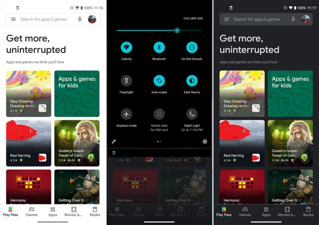 Sử dụng giao diện tối. Phiên bản Android 10 đã tích hợp chủ đề tối giúp chuyển các ứng dụng và giao diện người dùng sang màu đen. Bạn có thể kích hoạt giao diện tối trong phần cài đặt hệ thống. Một số thiết bị cũng có tùy chọn để lên lịch cho chủ đề tối tự động bật vào mỗi đêm và tắt vào buổi sáng. Ảnh: ExtremeTech.