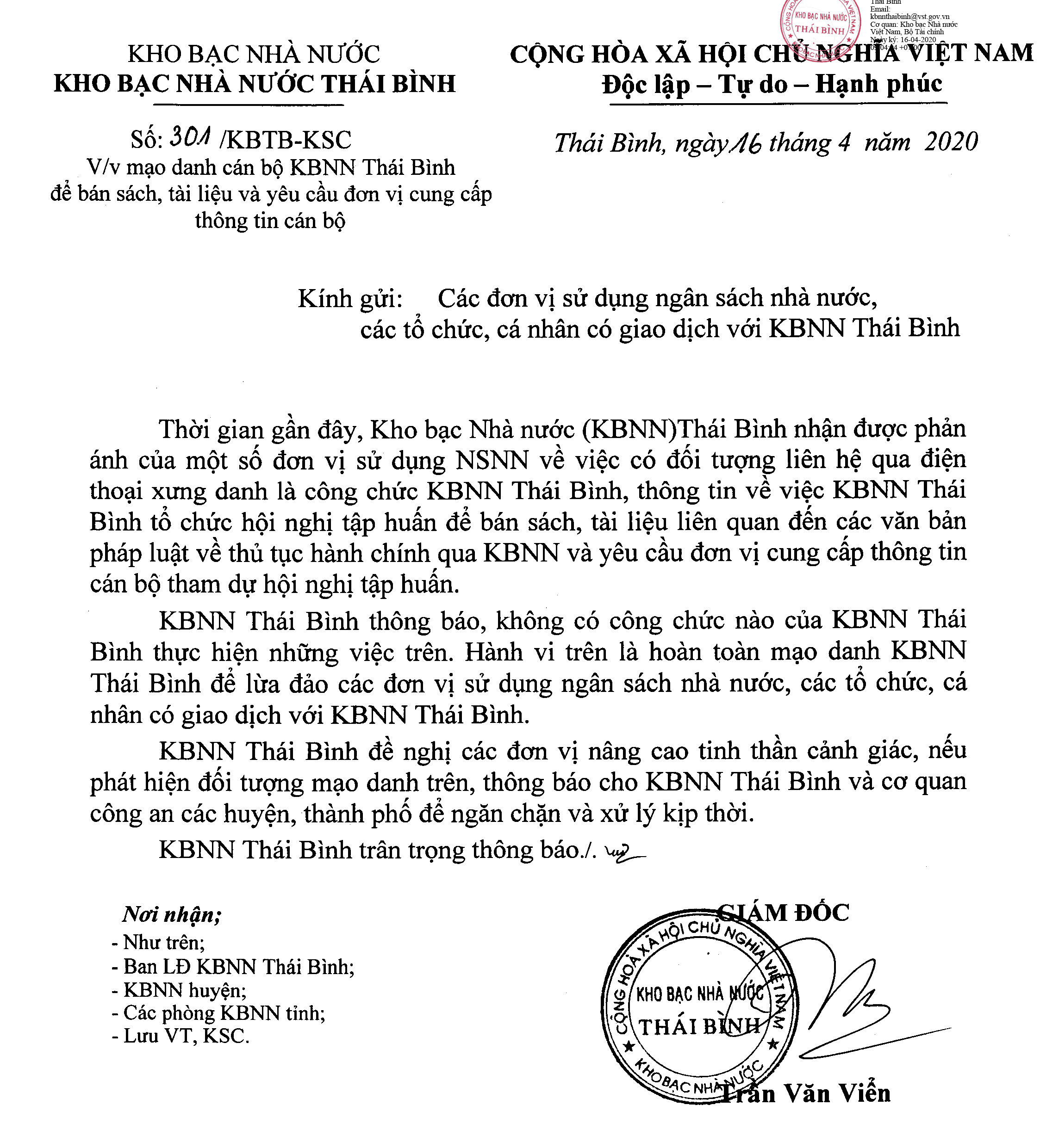 Ngày 16/4/2020, Kho bạc Nhà nước Thái Bình ra Thông báo số 301/KBTB- KSC về việc mạo danh cán bộ Kho bạc Nhà nước Thái Bình để bán sách, tài liệu và yêu cầu đơn vị cung cấp thông tin cán bộ.