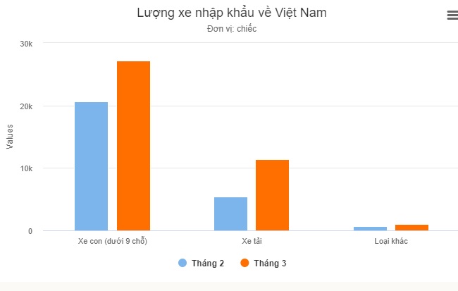 Theo Tổng cục Hải quan, tháng 3, Việt Nam nhập 12.151 ôtô nguyên chiếc, trị giá 224 triệu USD. Trong đó chủ yếu vẫn là xe con (dưới 9 chỗ, chiếm 80,9%) với số lượng 9.831 chiếc, tăng 20% so với tháng trước. Mỗi xe con về nước có giá trị khoảng hơn 16.500 USD, tương đương khoảng 388 triệu đồng.