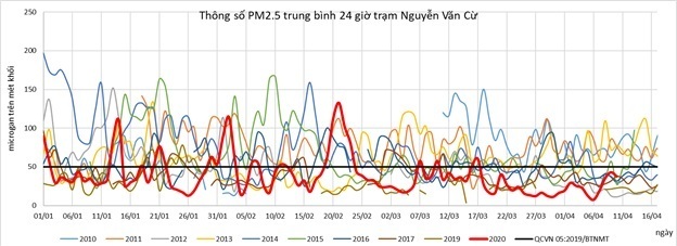 "Từ 20/3 đến 10/4 (thời gian bắt đầu cách ly xã hội) chất lượng không khí tốt hơn so với hai tháng đầu năm", Tổng cục môi trường nêu và thông tin thêm, trong hai ngày 8 và 9/4, khi số lượng xe cộ trong nội đô tăng lên (so với những ngày đầu cách ly xã hội), giá trị PM2.5 (bụi mịn) cũng tăng lên, nghĩa là chất lượng không khí kém đi trong hai ngày này.