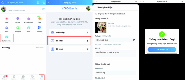Để tạo sự kiện, người dùng cần vào tab "Thêm", chọn mục "Sự kiện" và tạo Sinh nhật, Lễ cưới, Lễ tang tùy theo nhu cầu. Sau khi nhập đầy đủ thông tin và hình ảnh, hệ thống sẽ tự động tạo Thiệp sinh nhật, Thiệp cưới hoặc Cáo phó để người dùng có thể gửi lời mời cho bạn bè cùng tham dự. Một nhóm chat cũng được tạo tự động trên Zalo và là nơi diễn ra sự kiện trực tuyến.