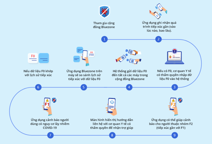 Để giải bài toán này, Bluezone - ứng dụng công nghệ định vị Bluetooth năng lượng thấp BLE - ra đời với mục tiêu hỗ trợ người dân bảo vệ chính họ và cộng đồng, góp phần kiểm soát sự lây lan của virus. Các smartphone cài Bluezone có thể giao tiếp với nhau trong khoảng cách hai mét, ghi nhận sự tiếp xúc gần vào lúc nào và trong bao lâu. Khi có một ca nhiễm Covid-19 mới, cơ quan y tế nhập dữ liệu F0 này vào hệ thống. Hệ thống sau đó gửi dữ liệu F0 đến các smartphone khác cài Bluezone. Lịch sử tiếp xúc với F0 trong 14 ngày trước đó sẽ được phân tích, đối chiếu và nếu trùng khớp, Bluezone sẽ cảnh báo cho người dùng có nguy cơ lây nhiễm, đồng thời hướng dẫn họ liên hệ với cơ quan y tế để nhận trợ giúp.