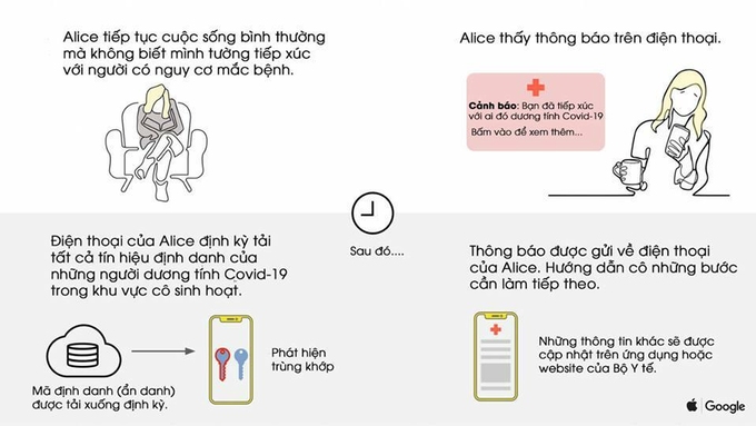 Ứng dụng do Apple và Google phát triển hoạt động như sau: Alice và Bob vô tình ngồi nhau nơi công cộng và nói chuyện trong khoảng 10 phút. Smartphone của cả hai người đều cài ứng dụng và bật Bluetooth. Vài ngày sau, Bob được phát hiện dương tính với Covid-19 và nếu đồng ý, điện thoại của Bob sẽ tải nhật ký tiếp xúc mà Bluetooth ghi nhận 14 ngày qua lên ứng dụng. Lúc này, ứng dụng đối chiếu dữ liệu vị trí của Alice và sẽ gửi cảnh báo tới cô cùng những người khác từng tiếp xúc gần với Bob.