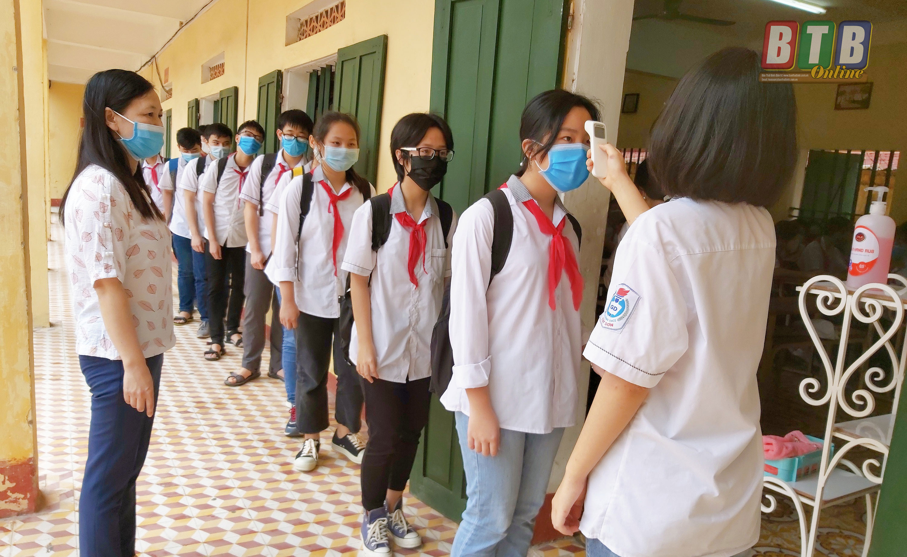 Học sinh Trường THSC Tây Sơn (thành phố Thái Bình) xếp hàng kiểm tra thân nhiệt trước khi vào lớp.