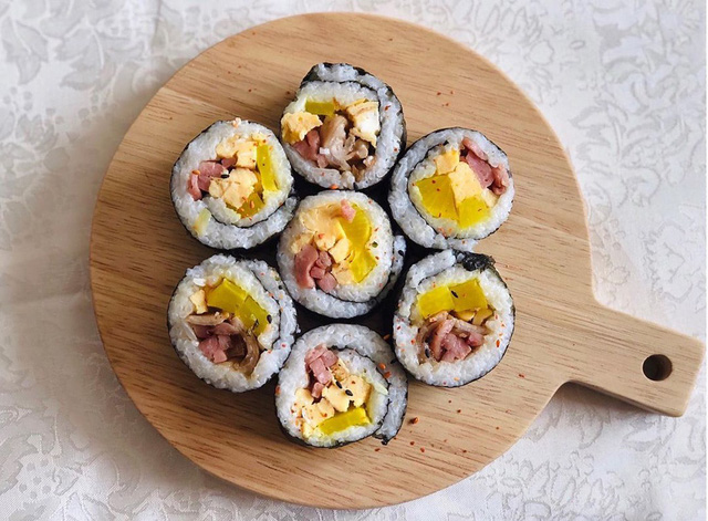 Kimbap là món cơm cuộn trong lá rong biển nổi tiếng xứ kim chi. Phần nhân kimbap bao gồm xúc xích, thanh cua, trứng rán, dưa leo, cà rốt. Các nguyên liệu được cắt thành thanh dài, dày khoảng 1 cm để dễ cuốn. Phần cơm được trộn cùng dầu mè để dậy mùi, thơm ngon hơn. Bạn trải đều cơm lên tấm rong biển, thêm các loại nhân và cuốn chặt tay để khi cắt, miếng cơm cuộn đẹp mắt.