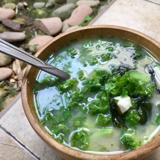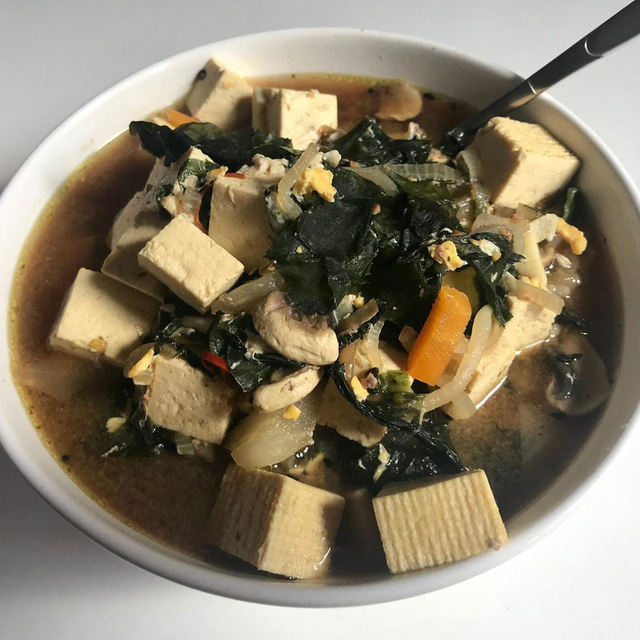 Sau đó, bạn cho rong biển, đậu hũ non, nấm hương, cà rốt vào nồi canh, đun thêm 10 phút, nêm nếm gia vị cho vừa miệng. Một chút tiêu, hành paro, dầu mè sẽ giúp món ăn dậy mùi hơn. Canh rong biển là món ăn nhẹ bụng, không quá nhiều chất béo và calo nhưng khá giàu canxi, sắt, protein cũng như các khoáng chất cần thiết cho cơ thể.