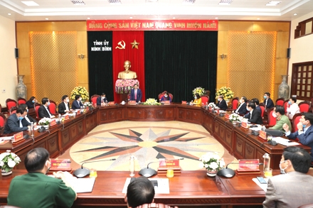 Đồng tình cao với các giải pháp, nhiệm vụ mà tỉnh đã đề ra trong thời gian tới, đồng chí Trưởng ban Tổ chức Trung ương đề nghị Tỉnh ủy, Ban Thường vụ Tỉnh ủy Ninh Bình tiếp tục đoàn kết, phát huy trí tuệ tập thể, nêu cao vai trò, trách nhiệm, sự gương mẫu của người đứng đầu, lãnh đạo, chỉ đạo tốt các nhiệm vụ phát triển KT-XH, công tác phòng chống dịch COVID-19, tiến hành đại hội Đảng các cấp đảm bảo đúng tiến độ. Đồng chí yêu cầu trong thực hiện các nhiệm vụ chính trị quan trọng thời gian tới, tỉnh cần nắm chắc diễn biến tình hình và dự báo tình hình thật tốt; thống nhất cao hơn nữa về tư tưởng, nhận thức, nỗ lực, quyết tâm hơn nữa để vượt qua khó khăn.