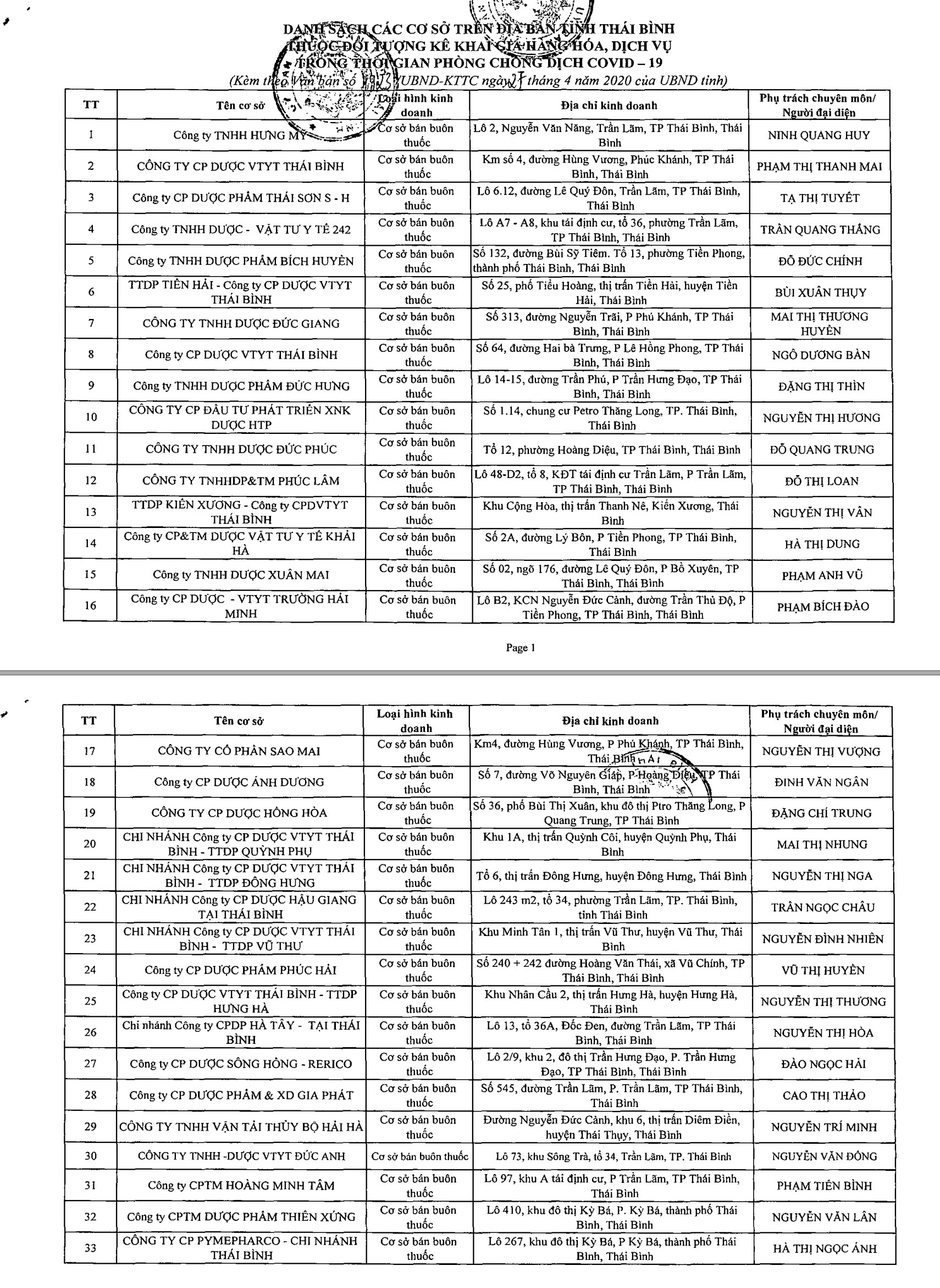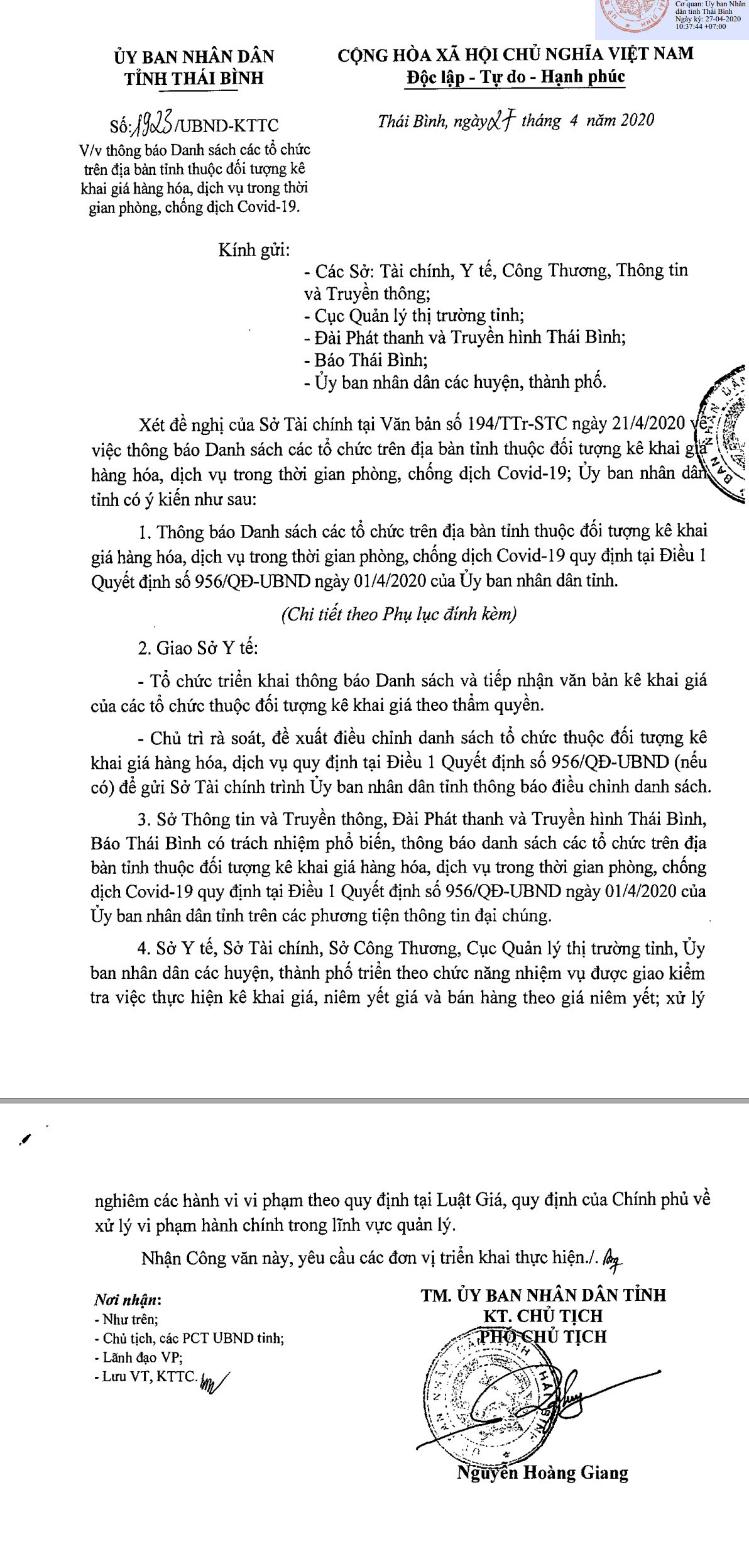 Ngày 27/4/2020, Ủy ban nhân dân tỉnh Thái Bình ban hành Công văn số 1923/UBND-KTTC về việc thông báo danh sách các tổ chức trên địa bàn tỉnh thuộc đối tượng kê khai giá hàng hóa dịch vụ trong thời gian phòng chống dịch Covid-19.