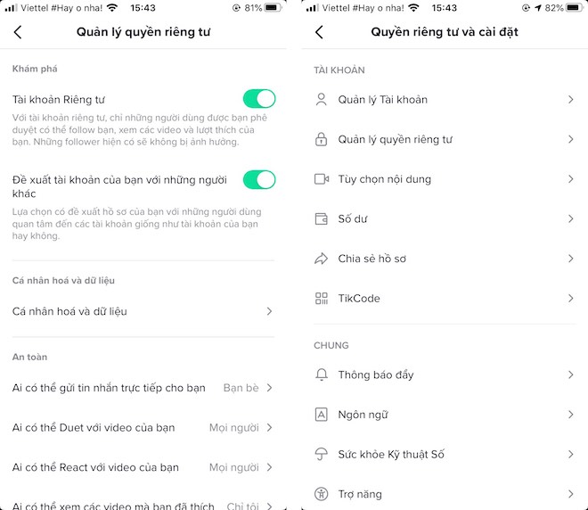 Tin nhắn trực tiếp: Giới hạn người có thể gửi tin nhắn đến tài khoản được kết nối hoặc tắt hoàn toàn chức năng nhắn tin trực tiếp. Để đảm bảo sự an toàn bảo mật của người dùng, TikTok đã có sẵn nhiều chính sách và kiểm soát khi nhắn tin. Ví dụ: Những người theo dõi được phê duyệt có thể nhắn tin cho nhau, giới hạn hình ảnh hoặc video không được phép gửi trong tin nhắn.