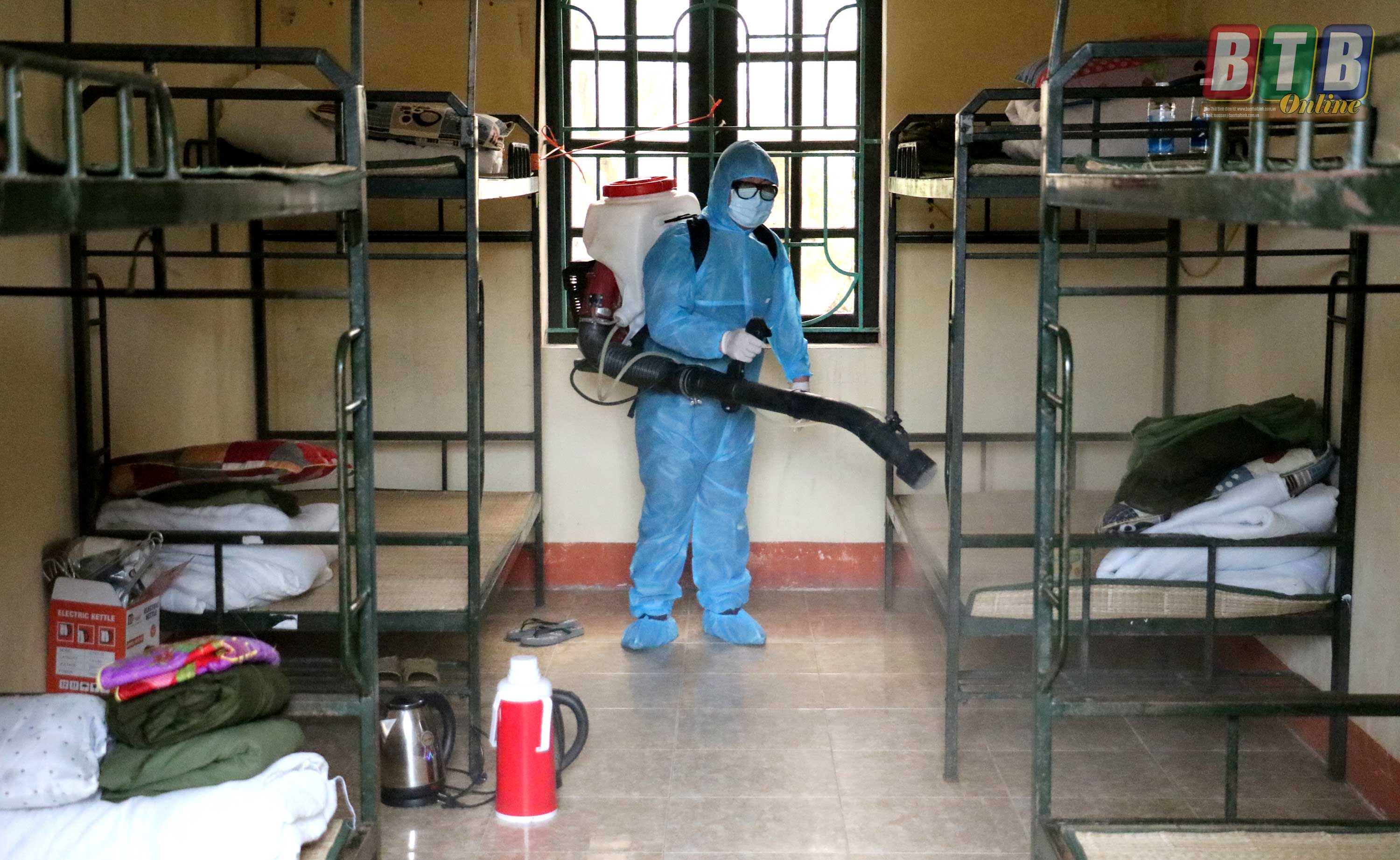 Cán bộ Trung đoàn 568, Bộ CHQS tỉnh phun thuốc khử trùng doanh trại sau khi hoàn thành đợt cách ly 14 ngày.