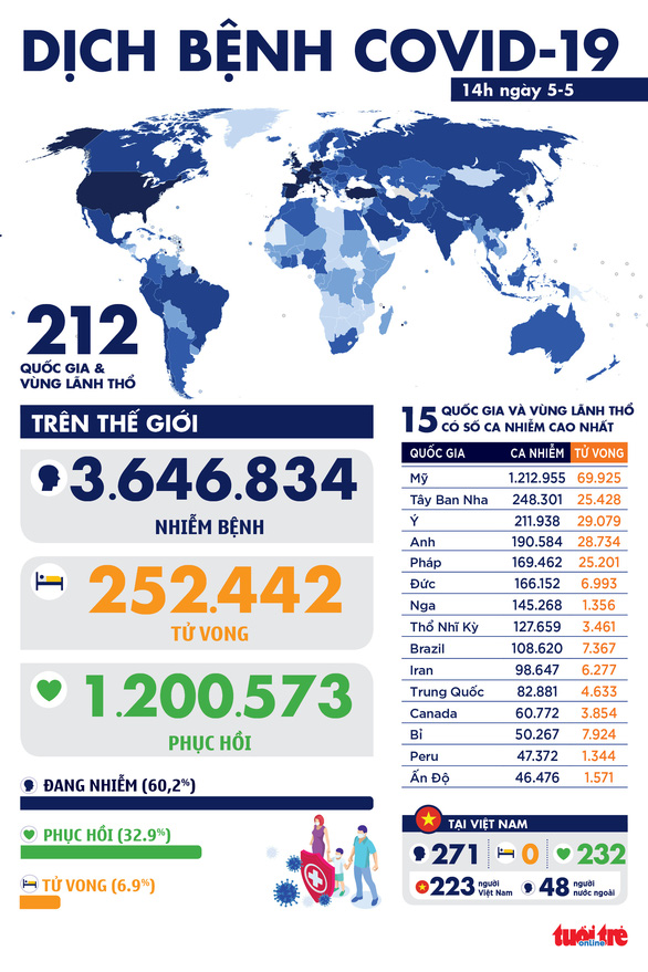 * Trung tâm ứng phó khủng hoảng của Nga ngày 5-5 cho biết số lượng người nhiễm mới với virus corona ở Nga trong vòng 24 giờ qua tăng lên 10.102 trường hợp và số tử vong mới tăng thêm 95 ca. Số ca nhiễm mới hôm nay giảm nhẹ so với 10.581 ca của ngày trước đó.