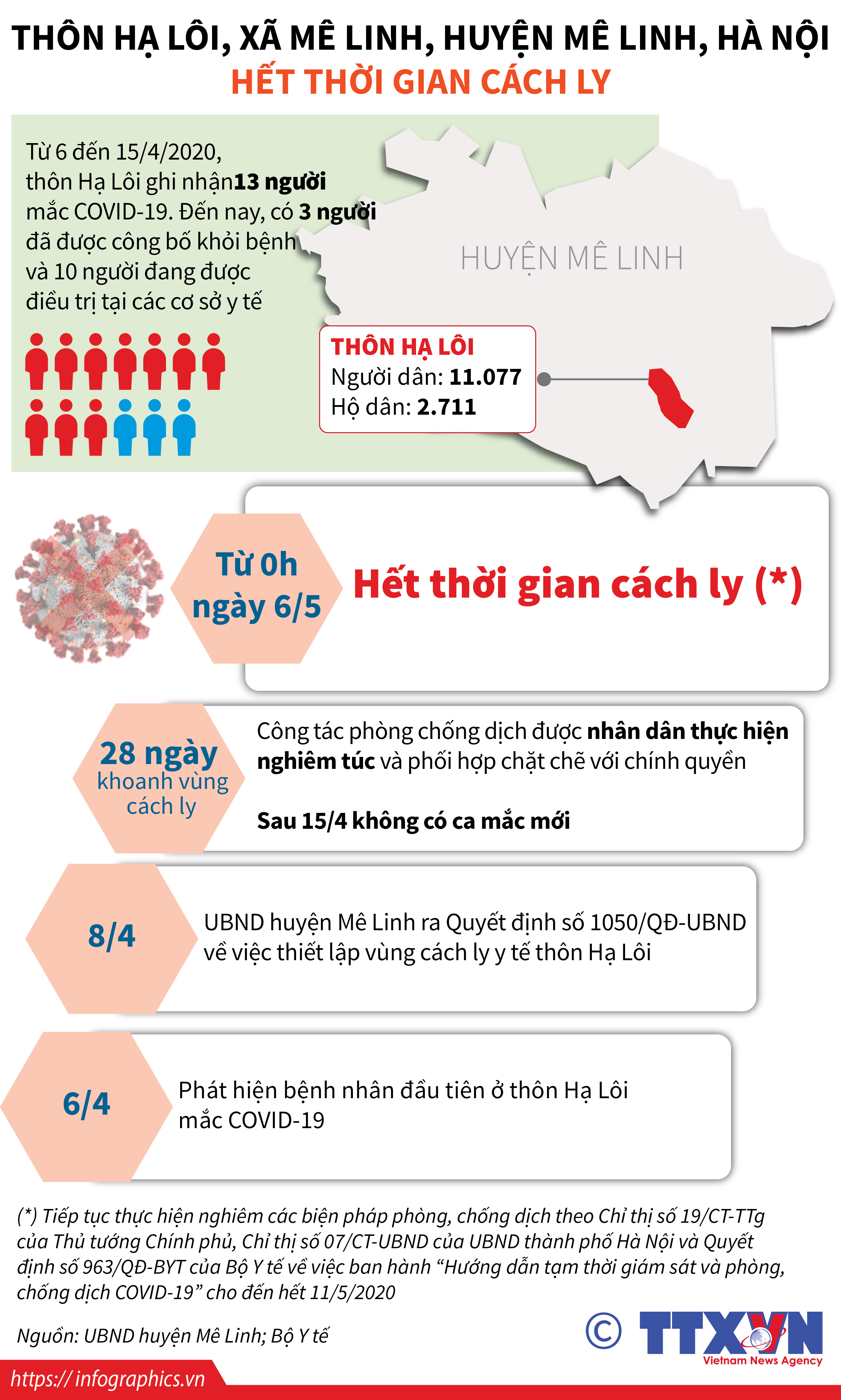 Theo Quyết định số 1184/QĐ-UBND của UBND huyện Mê Linh, từ 0h ngày 6/5/2020, thôn Hạ Lôi, xã Mê Linh, huyện Mê Linh, Hà Nội hết thời gian cách ly.