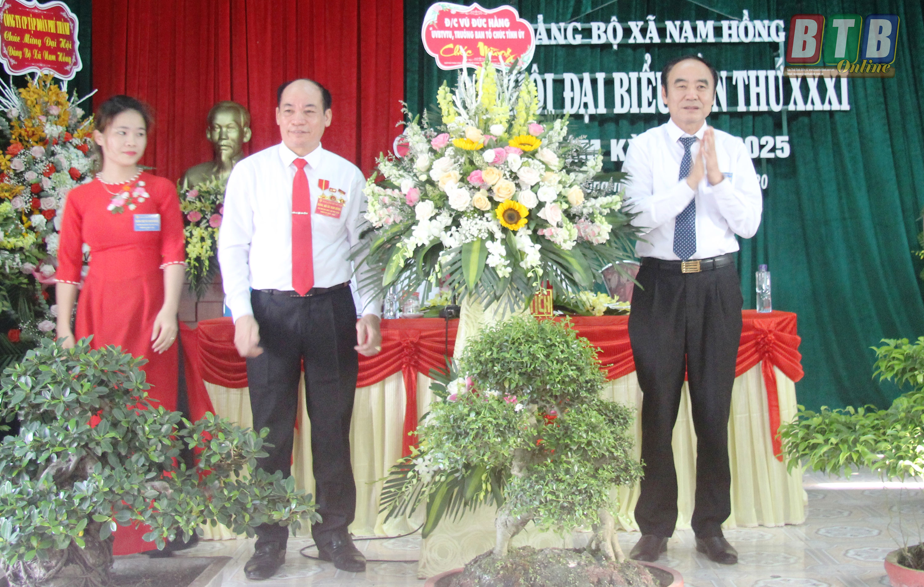 Đồng chí Vũ Đức Hằng, Ủy viên Ban Thường vụ, Trưởng ban Tổ chức Tỉnh ủy tặng hoa chúc mừng đại hội Đảng bộ xã Nam Hồng (Tiền Hải).